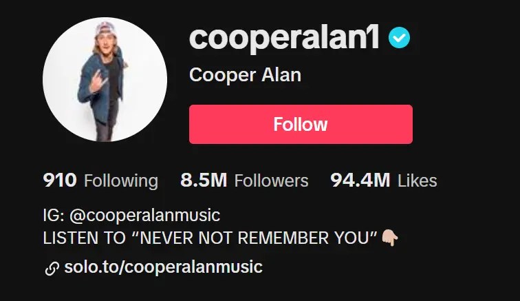 - His Tiktok id is cooperalan1 and has 8.8M+ Fans.